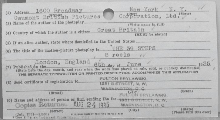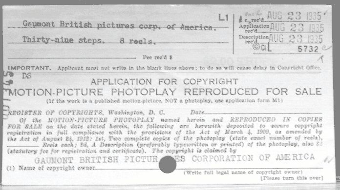 Alfred Hitchcock made the first film version of The 39 Steps twenty-one years after John Buchan published the novel by that title. (In actuality, Hitchcock retained only the basic situation and some major characters from the novel. It could be debated that the screenplay does not constitute a derivative version of the novel.) Hitchcock had earned a reputation for quality films at a time when most British films were considered by American distributors as unworthy of release outside Britain, so Gaumont British distributed few of its films in the United States. Gaumont British also asserted its prerogative as maker of the film to register the film for its American copyright. Regardless of whether it had been Gaumont British or an American affiliate which registered the American copyright, that registration had to be renewed during the 28th year of the term (according to the law in effect prior to 1978). No renewal was filed.