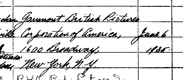 June 6 is thus (1) the review date in the London Times, (2) the publication date (specifically in “London, England”) on the Copyright Office file card, and (3) the publication date on other Copyright Office records, but June 6 is apparently not anywhere near the date that the film first played in New York City and Los Angeles, unless the Times of each city waited over three months to review a film from a director that The New York Times already regarded as significant.