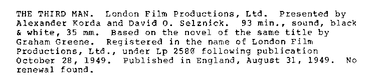 For the classic post-WW2 British film The Third Man, information provided by the Copyright Office is remarkably informative and without the ambiguities indicated in the above discussion of The 39 Steps On the Copyright Office Search Report (see illustration above), there are precise statements that the British publication date was August 31, 1949, and the American publication was October 28, 1949. This places the American date after the British, and there is a difference of more than thirty days. Although the search report juxtaposes the British publication with the American registration, the dates themselves are stated to be publication dates in both cases.