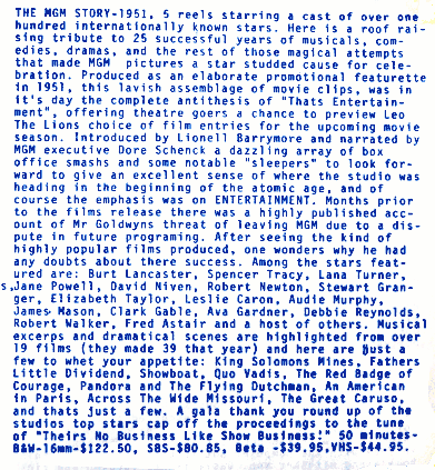 illustration: listing for The MGM Story as it appeared in a catalog supplement mailed to Thunderbird customers. Obviously, Dunnahoo or his copy-writer had difficulty with spelling and fact-checking.