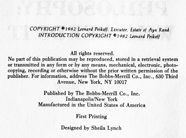 In the case of Philosophy: Who Needs It, the anthology enjoys separate copyright protection for: 1) its selection and sequence; 2) its new explanatory footnotes and explanatory comments; and 3) the introduction written specifically for the book. These are the things (and the only things) that would have been denied copyright had protection been lost for lack of proper notice. Readers who look at the above pictures should take notice that Leonard Peikoff claimed copyright in the introduction under his own name, which is proper given that Peikoff completed it through his own efforts after Ayn Rand’s death. Peikoff’s separate copyright for his introduction amounts to an explicit declaration as to what is the most substantive new material (as against pre-existing material, new arrangements, or brief new explanation) in the book as a whole.