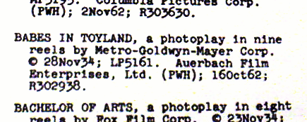 Copyright Catalog.) On the above image: dates in red are renewal dates; serial numbers in red are renewal numbers. “N.R.” indicates that no renewal was found in the renewal registrations. Those seeking the reference books should know that they are: (1) The Film Superlist series. The separate volumes are titled Film Superlist: Motion Pictures in the U.S. Public Domain and divided into the same ten-year and multi-decade groupings as the Cumulative Copyright Catalogs prepared by the U.S. Copyright Office. The series was originated by Walter E. Hurst (publishing through 7 Arts Press) and continued after Hurst’s death by D. Richard Baer (publishing through Hollywood Film Archive); (2) Motion Picture Copyrights and Renewals 1950-59, by David Pierce, published by Milestone & Co., 1989. This second company issued just the one volume. The image with the red addenda (immediately above) is a mock-up made by the copyrightdata.com editor, and although it resembles the listings in the above-named books, this image was not copied from either of those publications. The red text was added electronically to an image scanned directly from a copy of Cumulative Copyright Catalog, Motion Pictures, 1950-59 (published by the U.S. Copyright Office). Most listings in the Catalog of Copyright Entries and the Cumulative Copyright Catalog are individual listings of one title with one registration. For the above two-image illustration, I chose a listing with multiple registrations. (It’s one television series with hundreds of weekly episodes. The illustrations cut short the list of episodes early in the alphabetic list.) In this way, I provided the largest number of collated listings possible in the smallest amount of space. Those consulting the actual Film Superlist and Motion Picture Copyrights and Renewals books will find that each separate work takes up the better part of a column inch of space on the page, in that almost every listing has its own claimant, length and format information in addition to title, date and registration number. |