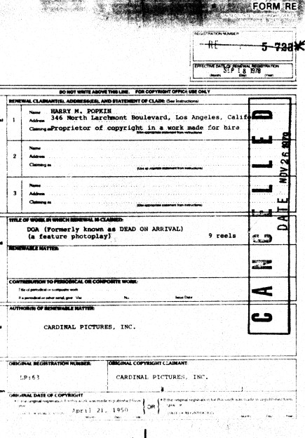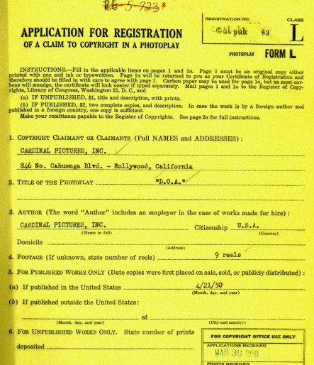The Law Department at Metro-Goldwyn-Mayer Inc. in New York wrote a letter dated October 29, 1962, to the Register of Copyrights at the Library of Congress advising the Copyright Office that the firm’s copyright renewal of Babes in Toyland was in error. The Copyright Office date-stamped the letter as received October 30, 1962. In the letter, MGM stated that “we no longer have any rights in said picture.” In a subsequent filing, it became part of the Copyright Office records that MGM signed a quitclaim to Auerbach Film Enterprises, Ltd. The quitclaim covered MGM’s “right, title and interest in the renewal of copyright and any extension of copyright in the motion picture photoplay entitled BABES IN TOYLAND (also known under the title THE MARCH OF THE WOODEN SOLDIERS) which was originally copyrighted in the name of Metro-Goldwyn-Mayer Corporation, […].” The consideration received by MGM for assigning any such rights it may have had was “the sum of Ten Dollars ($10.00) and other good and valuable consideration” — which suggests that MGM didn’t regard themselves as having any rights to offer other than a clearing-up of confusion. The change in title was important to reflect in the record. On November 26, 1975, E. Fulton Brylawski, writing on behalf of the Law Offices of Fulton Brylawski and the then-rights-holder of 1934 movie version of Babes in Toyland, wrote the Register of Copyrights asking that the assignment records be revised to reflect that “the picture has been re-issued and distributed under the title MARCH OF THE WOODEN SOLDIERS”. Thereafter, anyone searching the assignment records would find cross-references from one title to the other in the Copyright Office files. What if a party without rights is the only one to file copyright renewal? In the above events, the filing of a copyright renewal by a party without legitimate rights turned out not to put the work into the public domain — because there was another renewal registration. (Auerbach, in the language of the quitclaim assignment, “has succeeded to all the rights and interests of Hal Roach Studios, Inc.” relevant here.) The question arises: what if MGM had been alone in filing a renewal? That renewal would have been just as invalid as was the one which MGM itself disavowed October 29, 1962. Therefore, researchers interested in determining the copyright status of works should look out for instances where there is but one renewal registration with that one registration being defective. The Citations and Court Summaries section of this web site provides a summary of a court decision where the single renewal filed proved to be invalid. In Alice T. Yardley v. Houghton Mifflin Co., Inc., the copyright renewal was described as “wholly void and of no effect” because the registrant was not entitled to renew. The Copyright Office Records an Invalid Renewal The sheer number of registration forms and renewal applications received by the U.S. Copyright Office has long been so high that it is understandable that, for the employees of the Copyright Office, the task of accurately processing all of this paperwork can be daunting. Given that the records of the Copyright Office are the premiere resource for those seeking to determine the copyright status of published works, it is important that they be accurate. As demonstrated on another page of this web site (see the illustrations page on copyright renewal and read the passages concerning Road to Bali), the Copyright Office will send correspondence to an applicant seeking to file a copyright renewal where there is the legitimate reason to refuse the application on grounds of it being untimely. However, in one instance in 1978, the Copyright Office processed and recorded a copyright renewal — and then months later corrected their records to reflect that the renewal had not met the legal requirements for one. To see why the movie D.O.A. (released 1950) was stripped of its copyright renewal, it’s important to see what was noted when the film was first copyrighted in 1950. Reproduced below is the copyright registration form processed in 1950: