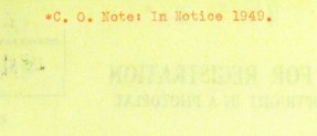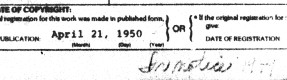 The fact that the copyright term had to be measured from 1949 apparently escaped the Copyright Office employee who first examined the application and the records. Thus, the renewal application was processed and was assigned number RE 5-723, as has been stamped in the top right corner above. At a late time, this was crossed out. Also at a later time, the form was marked with a huge stamp reading “CANCELLED.” The date of cancellation is indicated as fourteen months after the renewal was allowed to go into the record. In a detail of the renewal form reproduced in an enlargement below, you can see that the “original date of copyright” was typed in by the copyright proprietor as April 21, 1950. Just below, by hand, the Copyright Office wrote in “In notice 1949”.