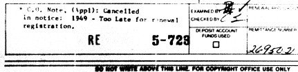 On the back side of the renewal application, at the top of the page where renewal applicants must leave the boxes blank so that the Copyright Office can fill in the details, you can see (in the illustration below) that the Copyright Office stamped in the number “RE 5-723” and also that a note was typed in, stating “Cancelled” and giving the reason: “Too Late for renewal registration.”